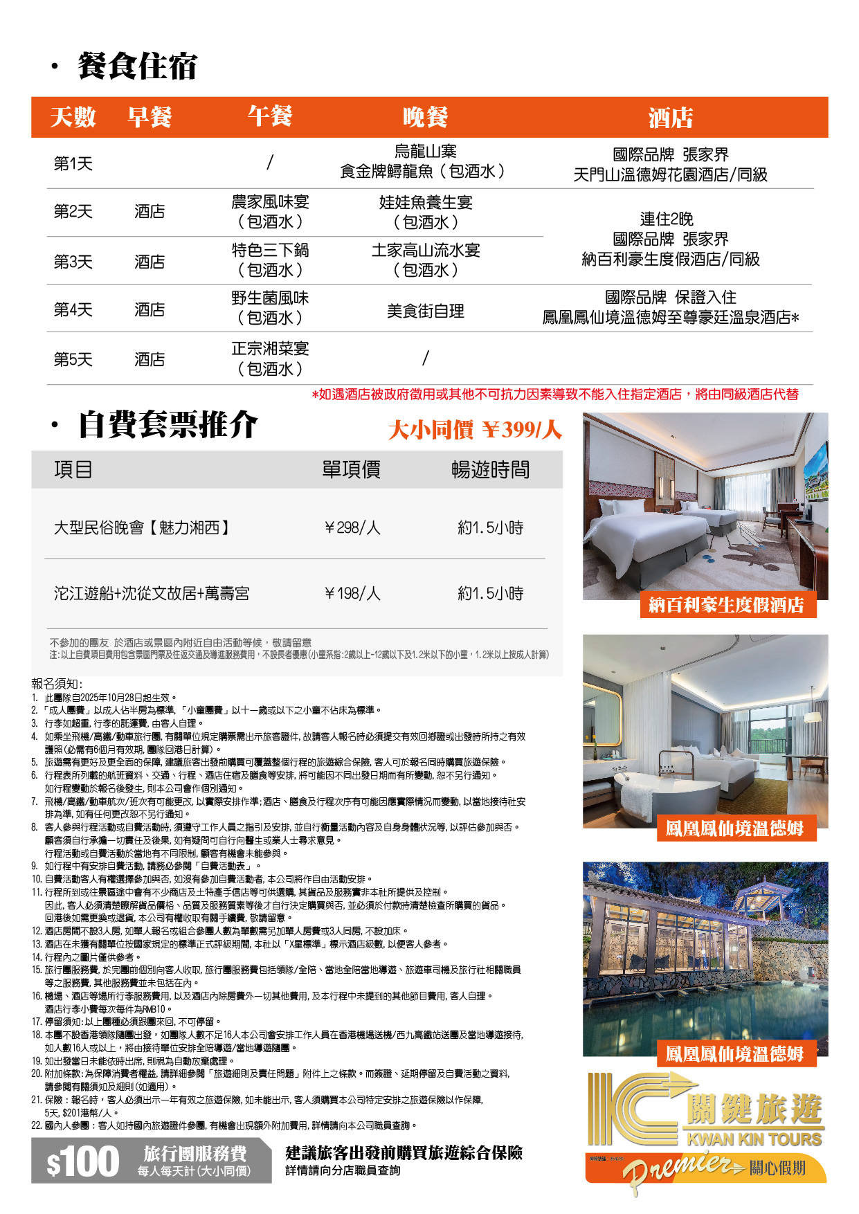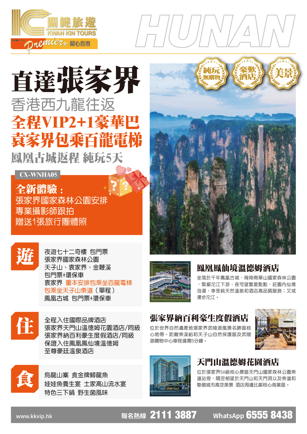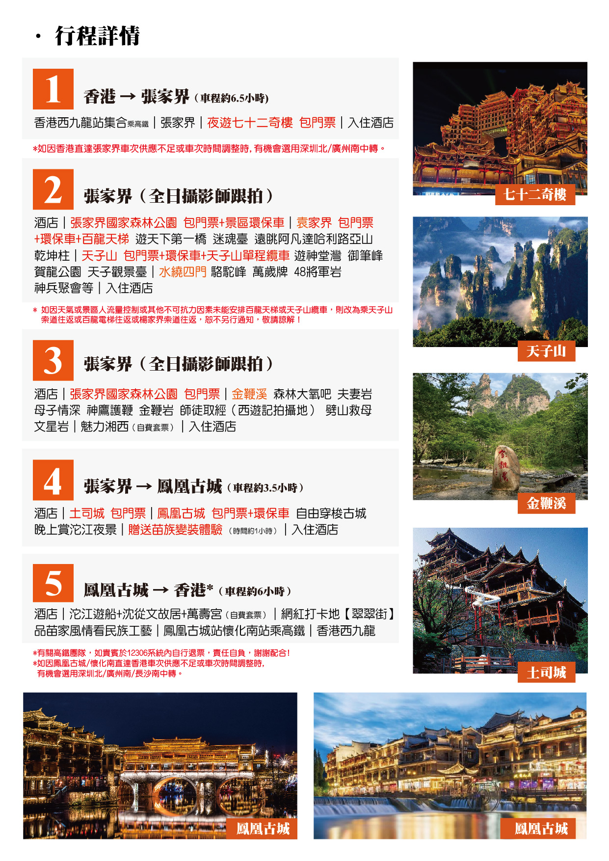 西九龍往返,去程直達張家界,鳳凰古城返程 張家界國家森林公園安排專業攝影師跟拍,贈送1張旅行團體照 住宿:全程入住國際品牌 張家界天門山溫德姆花園酒店/同級、張家界納百利豪生度假酒店/同級、保證入住鳳凰鳳仙境溫德姆至尊豪廷溫泉酒店 暢遊:夜遊七十二奇樓(包門票)、張家界國家森林公園(包門票+環保車)天子山(重本安排乘坐百龍電梯)、袁家界(包乘坐天子山索道)、金鞭溪 鳳凰古城包門票+環保車