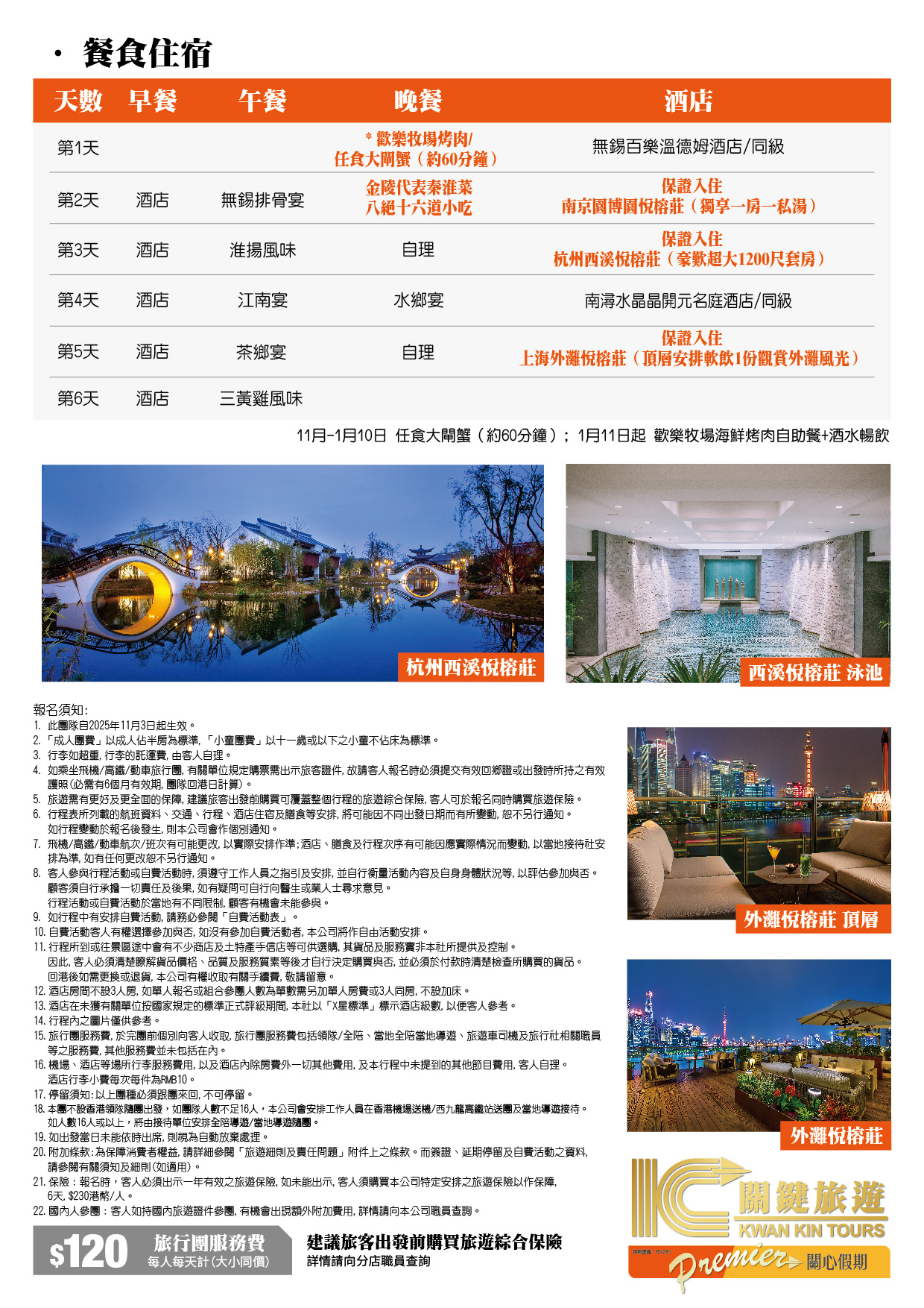 住宿:超班住宿安排 【杭州西溪濕地悅榕莊】豪歎超大1200尺套房、【南京園博園悅榕莊】獨享一房一私湯、【上海外灘悅榕莊】頂層安排軟飲1份觀賞外灘風光 暢遊:【無錫惠山古鎮】賞金秋紅楓、江南名園【寄暢園】賞銀杏、杭州西湖新天地、南京報恩寺、南潯古鎮、杭州西溪濕地國家公園 品嚐:特別安排【金秋蟹宴】(每人一公一母)、金陵代表秦淮菜【八絕十六道小吃】