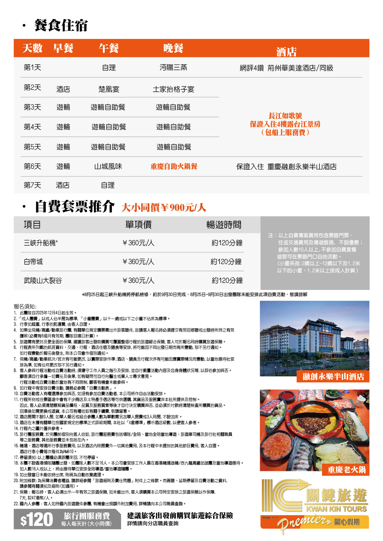 住:保證入住4樓【江景客房】每間客房均有獨立衛生間、落地門窗和獨立觀光露台; 遊:四大目的地【江城武漢、巡遊三峽、山水宜昌、山城重慶】;【瞿塘峽&夔門&巫峽&西陵峽】 湖北遊:江南名樓黃鶴樓、荊州古城、三國關羽祠;重慶遊:體驗李子壩輕軌穿樓、磁器口、洪崖洞;巴渝錦繡梨園(重本包門票+品茶觀表演) 食:沔陽三蒸、土家抬格子宴、特別安排品嚐地道山城自助火鍋