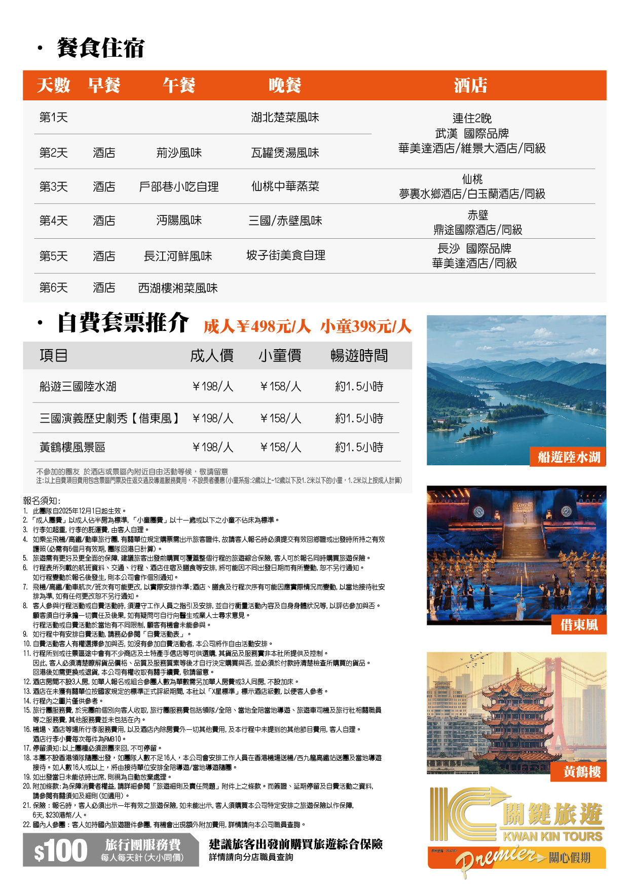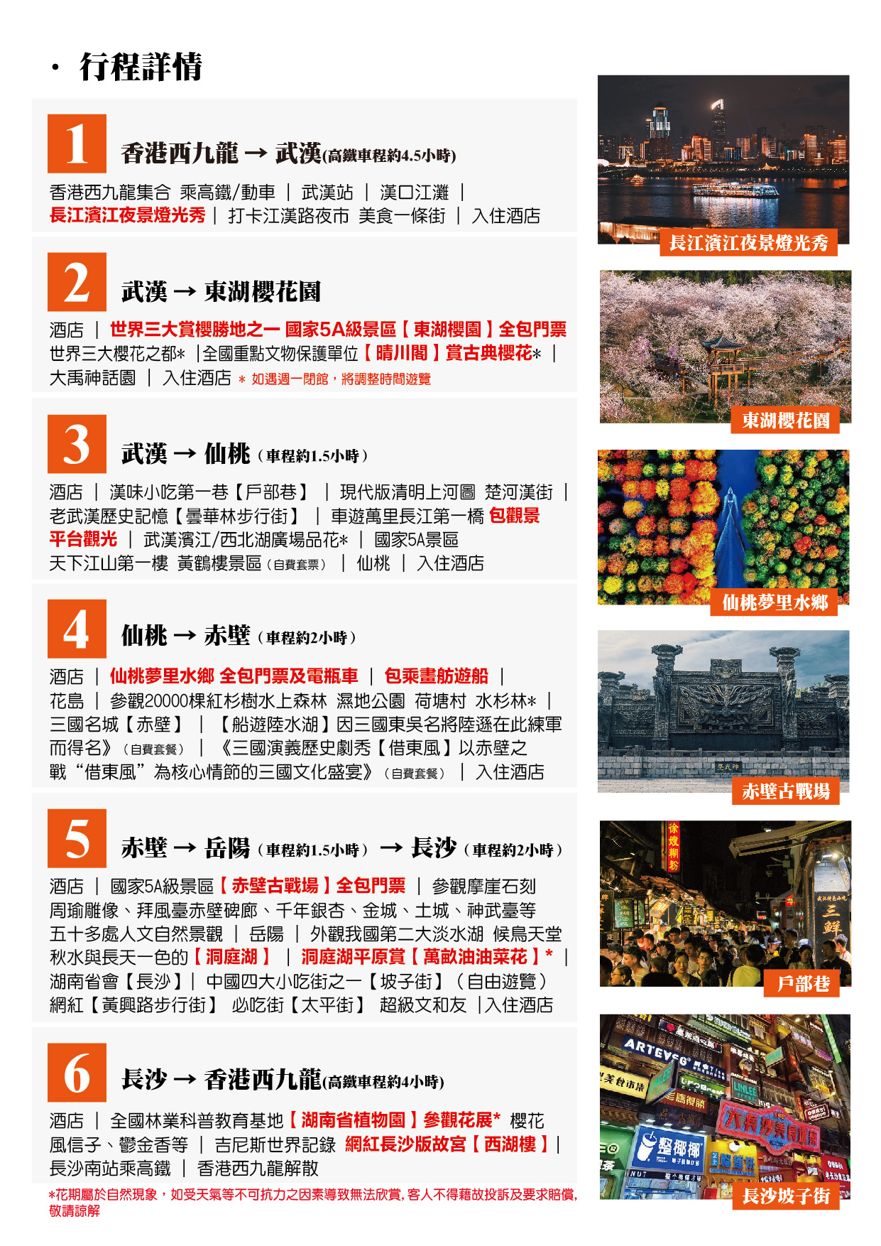 品嚐:湖北楚菜風味 瓦罐煲湯風味 中華蒸菜 三國/赤壁風味 西湖樓湘菜風味 住宿:升級武漢連住2晚國際品牌酒店 長沙1晚國際品牌酒店 暢遊:世界三大賞櫻勝地之一國家5A級景區【東湖櫻園】 現代版清明上河圖【楚河漢街】晴川閣 賞古典櫻花 大禹神話園 仙桃夢裡水鄉景區全包門票及電瓶車包乘畫舫遊船 國家5A級景區【赤壁古戰場】洞庭湖平原賞【萬畝油油菜花】