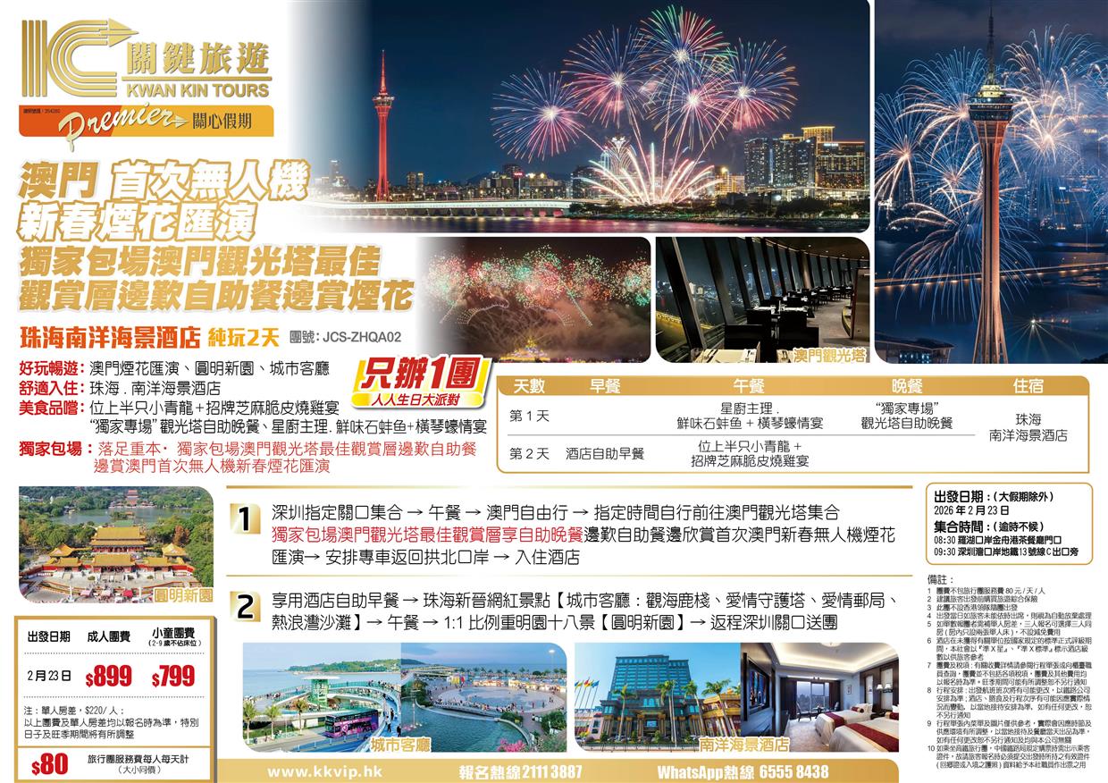澳門首次無人機新春煙花匯演 獨家包場澳門觀光塔最佳觀賞層邊歎自助餐邊賞煙花 珠海南洋海景酒店純玩2天