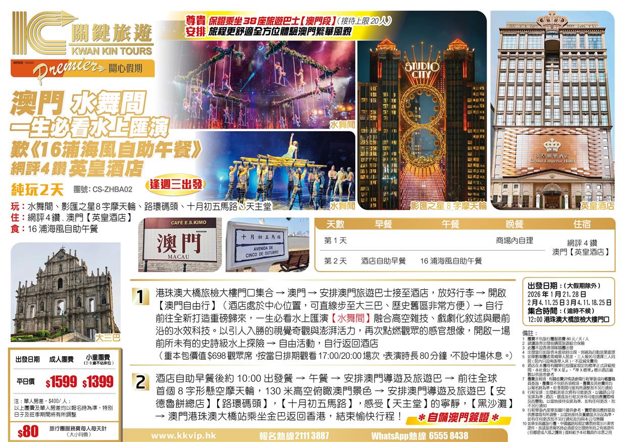 澳门 一生必看水上匯演【水舞間】 歎《16浦海風自助午餐》 網評4鑽.澳門【英皇酒店】 純玩2天
