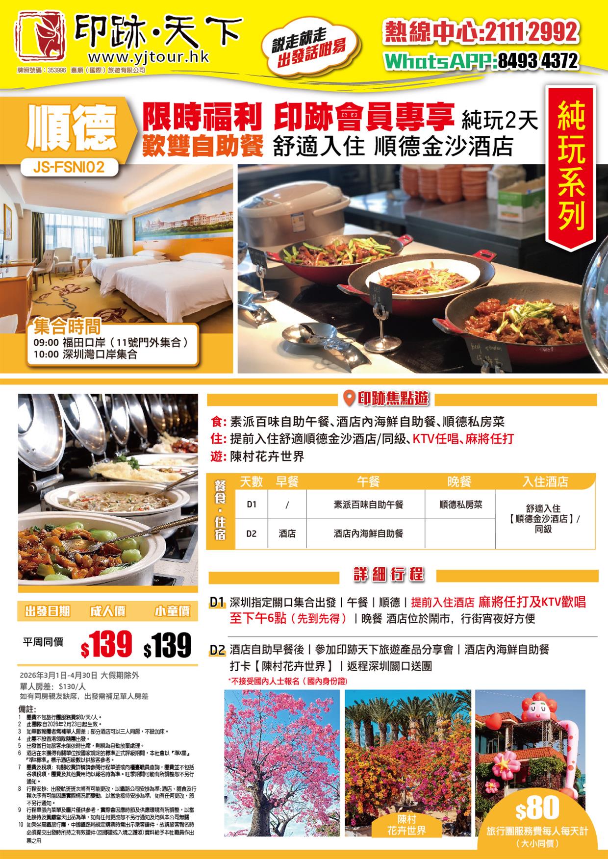 食:素派百味自助午餐、酒店內海鮮自助餐、順德私房菜 住:提前入住舒適順德金沙酒店/同級、KTV任唱、麻将任打 遊:陳村花卉世界