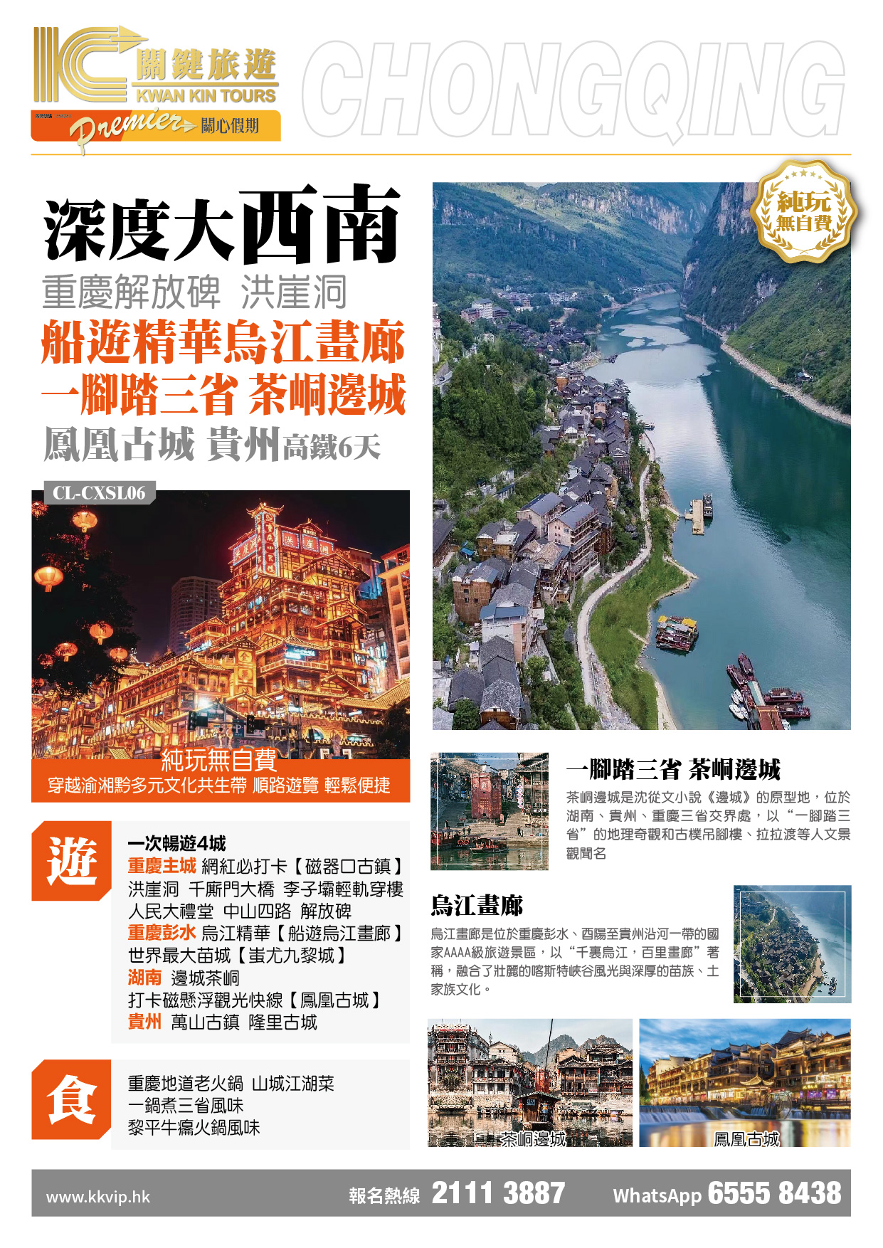 暢遊:一次暢遊4城 重慶主城:網紅必打卡磁器口古鎮 洪崖洞 千廝門大橋 李子壩輕軌穿樓 人民大禮堂中山四路解放碑 重慶彭水:烏江精華 船遊烏江畫廊、世界最大苗城 蚩尤九黎城景區 湖南:邊城茶峒 打卡磁懸浮觀光快線 鳳凰古城 貴州:萬山古鎮、隆裏古城 品嚐:重慶地道老火鍋 山城江湖菜 一鍋煮三省風味 黎平牛癟火鍋風味