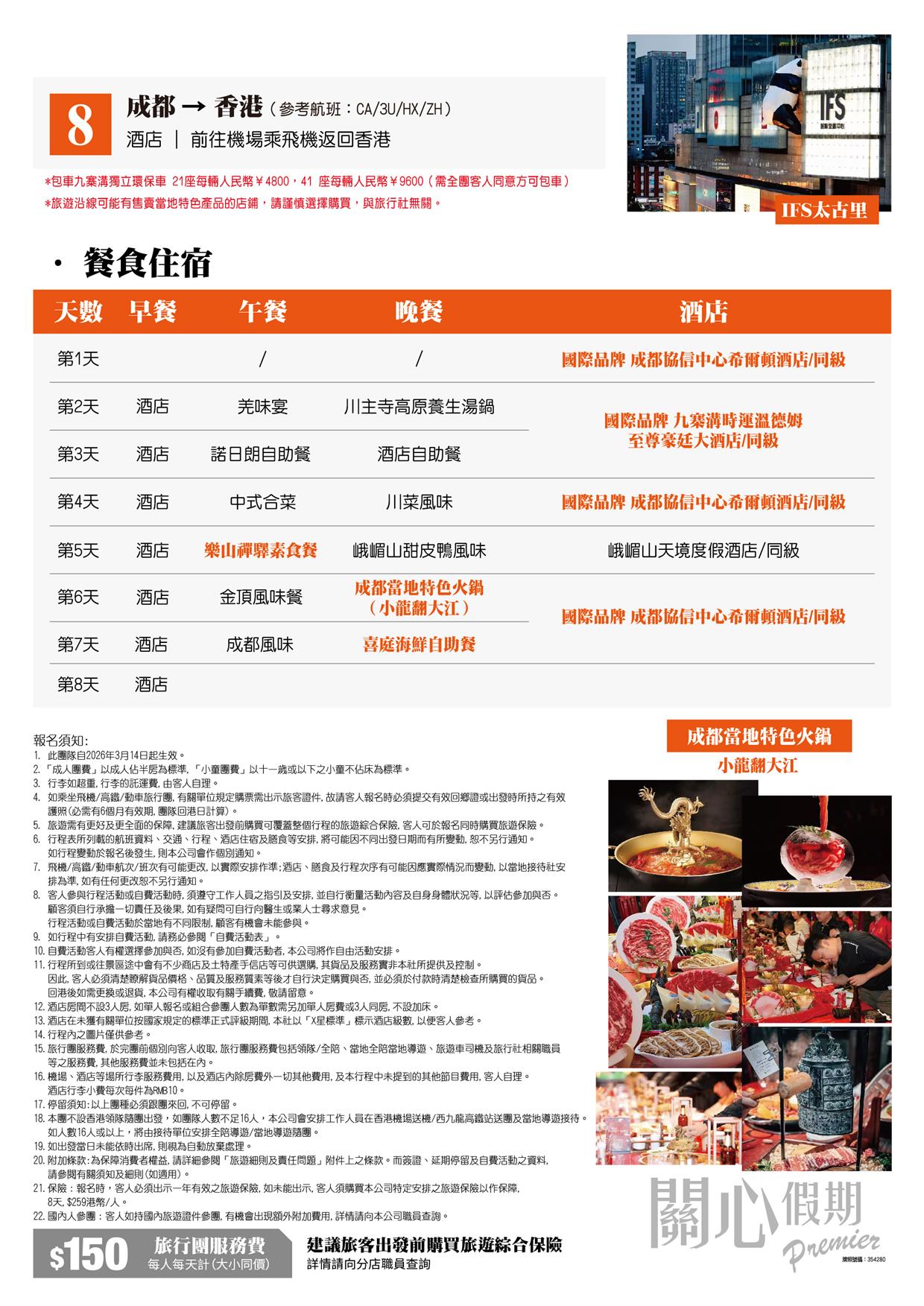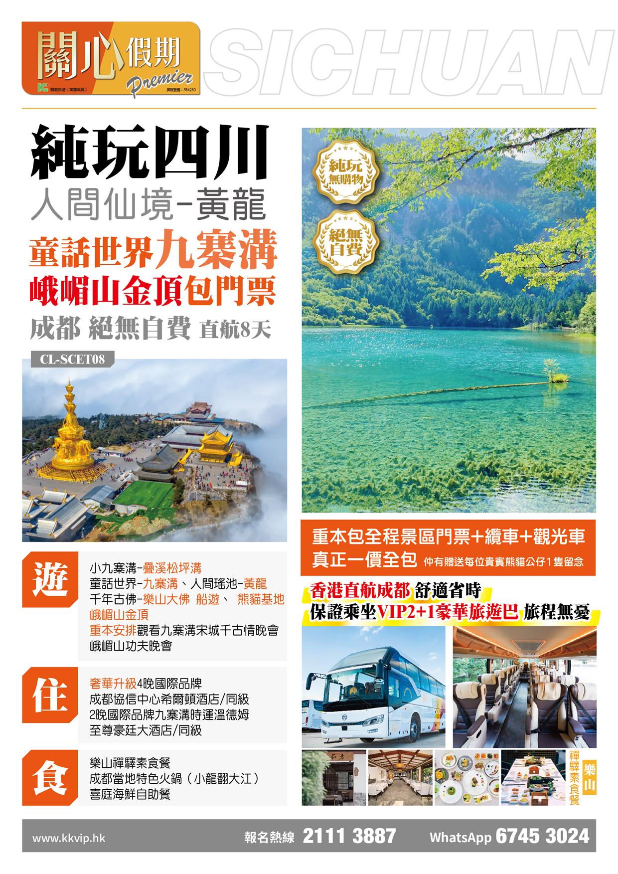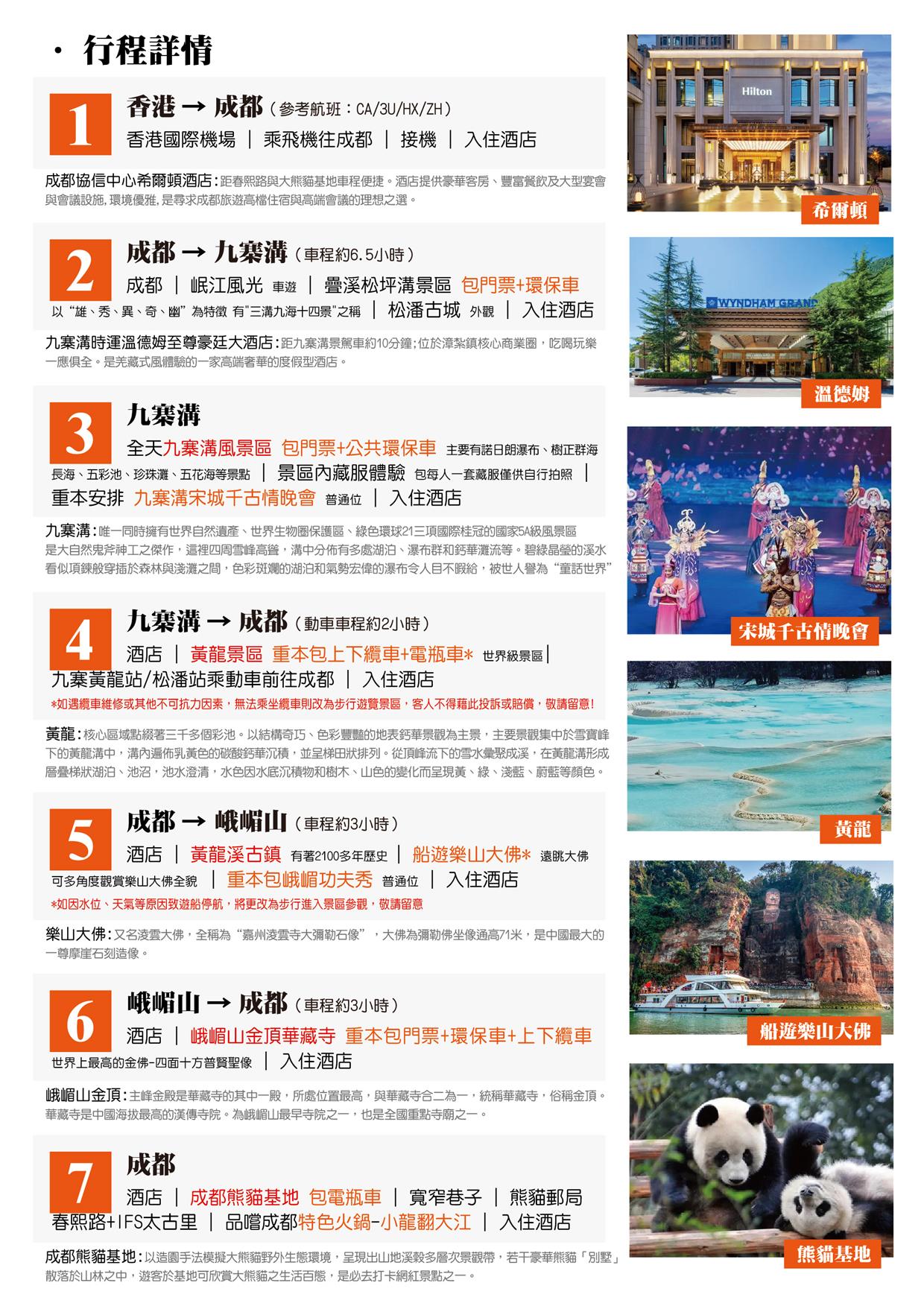 讚:全程VIP2+1旅遊巴士 提升舒適度、重本安排觀看九寨溝宋城千古情晚會,峨嵋山功夫晚會 酒店:奢華升級4晚國際品牌成都協信中心希爾頓酒店/同級、2晚國際品牌九寨溝時運溫德姆至尊豪廷大酒店/同級 品嘗:樂山禪驛素食餐、成都當地特色火鍋(小龍翻大江)、喜庭海鮮自助餐 暢遊:重本包全程景區門票+纜車+觀光車 童話世界【九寨溝】、人間瑤池【黃龍】、船遊樂山大佛、熊貓基地、疊溪松坪溝、峨嵋山金頂