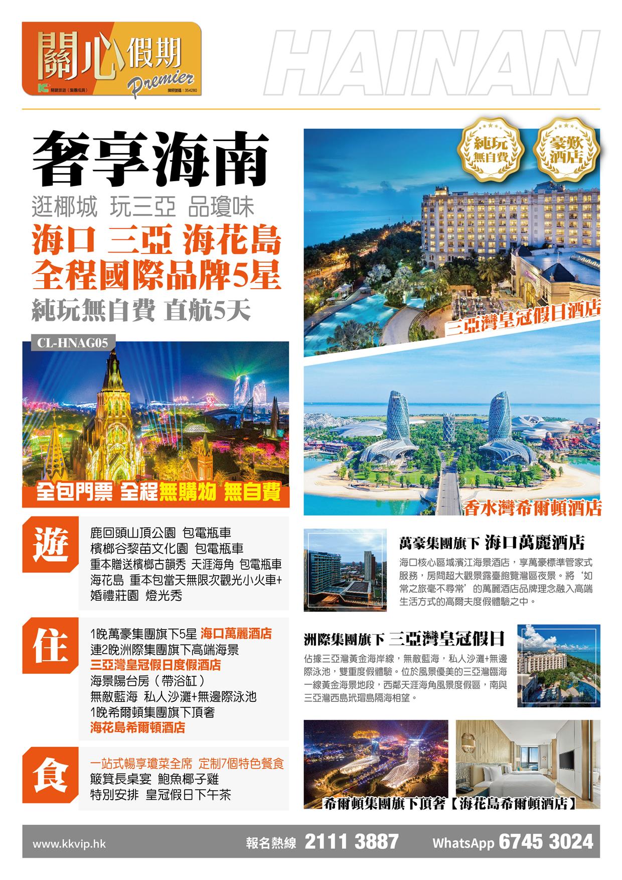 奢住: 全程鎖定國際奢牌酒店,1晚萬豪集團旗下豪華五星【海口萬麗酒店】、連住 2晚洲際集團旗下高端海景【三亞灣皇冠假日度假酒店】、1晚希爾頓集團旗下頂奢【海花島希爾頓酒店】 味蕾:一站式暢享瓊菜全席 量身定制七個特色餐食文昌雞風味│|加積鴨風味│簸箕長桌宴│ 鮑魚椰子雞 暢玩:直航免轉機+經典網紅景點全覆蓋 全程0購物 0自費 鹿回頭山頂公園(包電瓶車)、檳榔谷黎苗文化園(包電瓶車